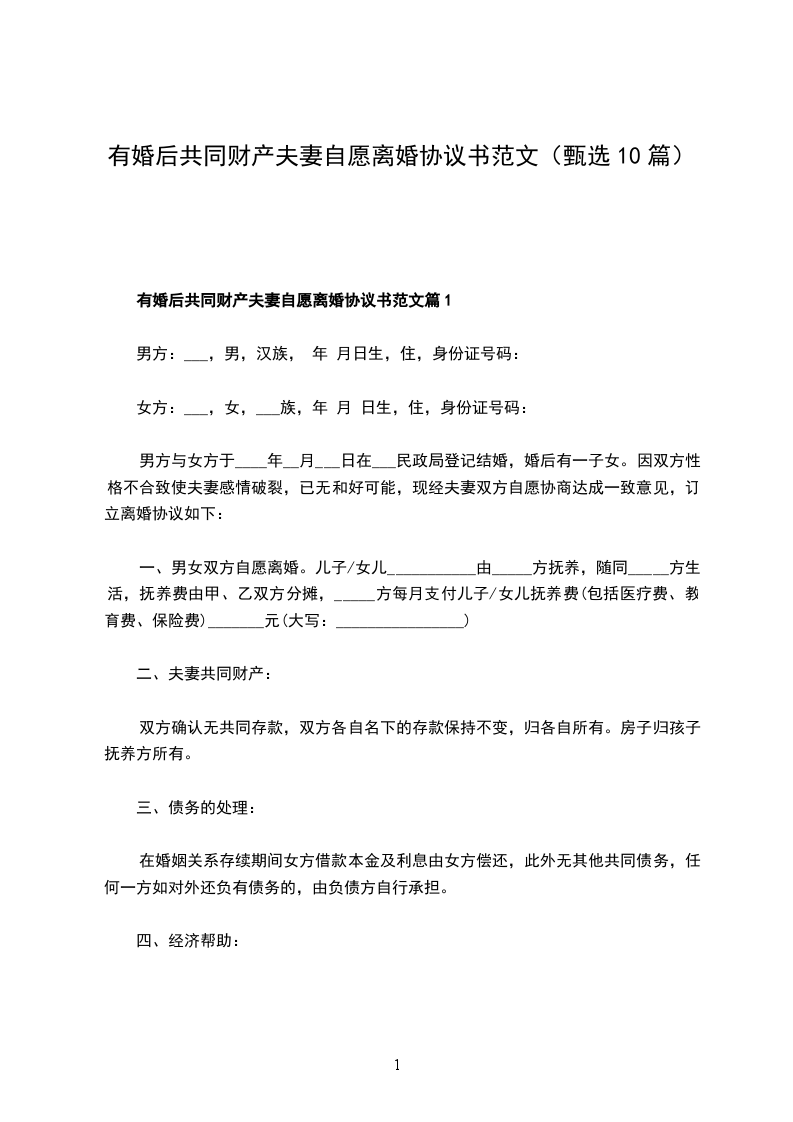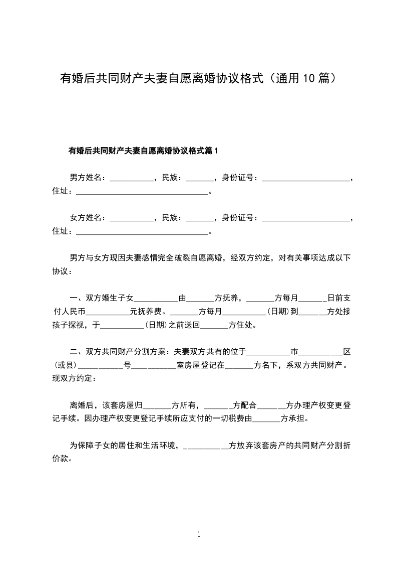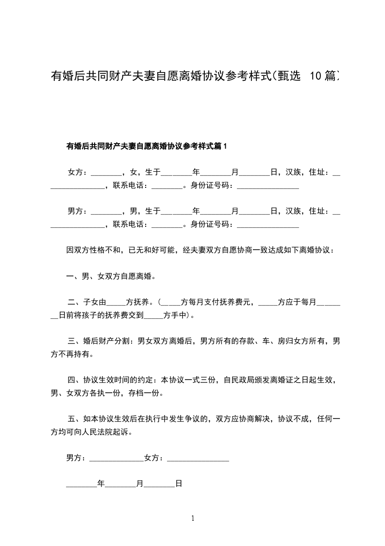有婚后共同财产夫妻自愿协议离婚书参考样板篇10