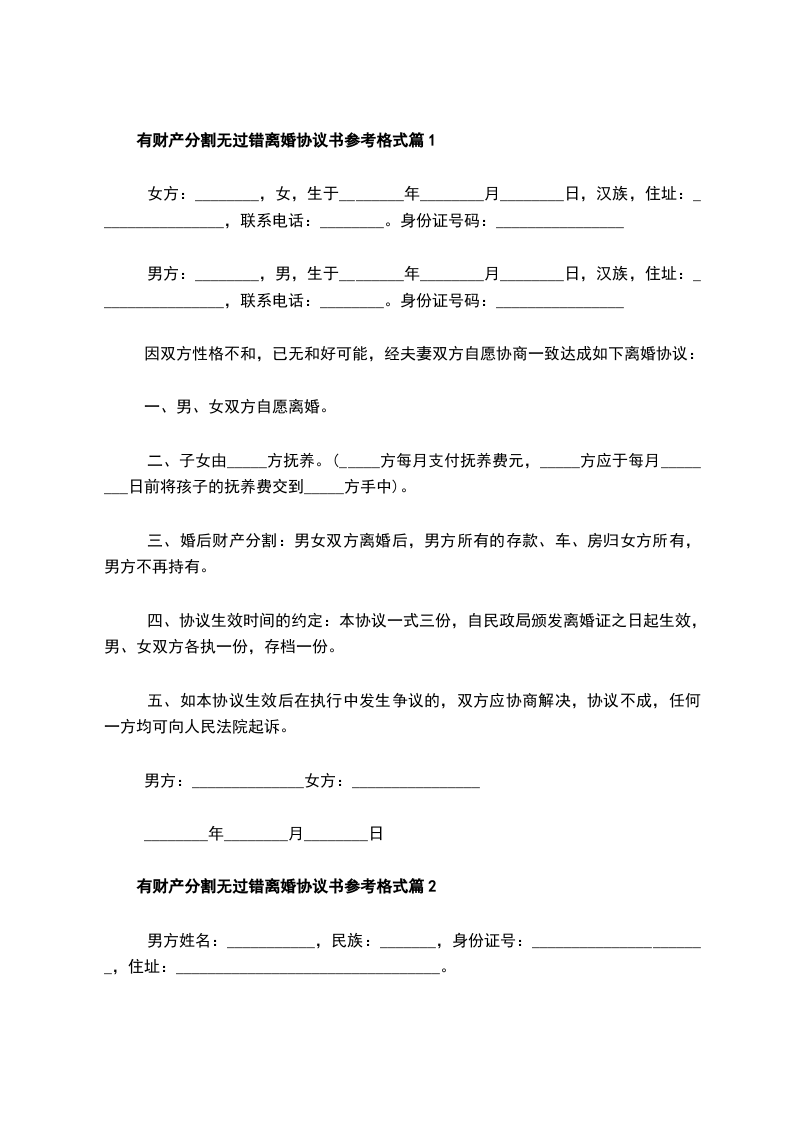 有财产分割无过错离婚协议书参考格式篇9