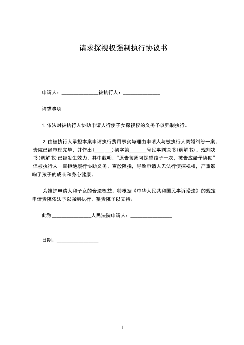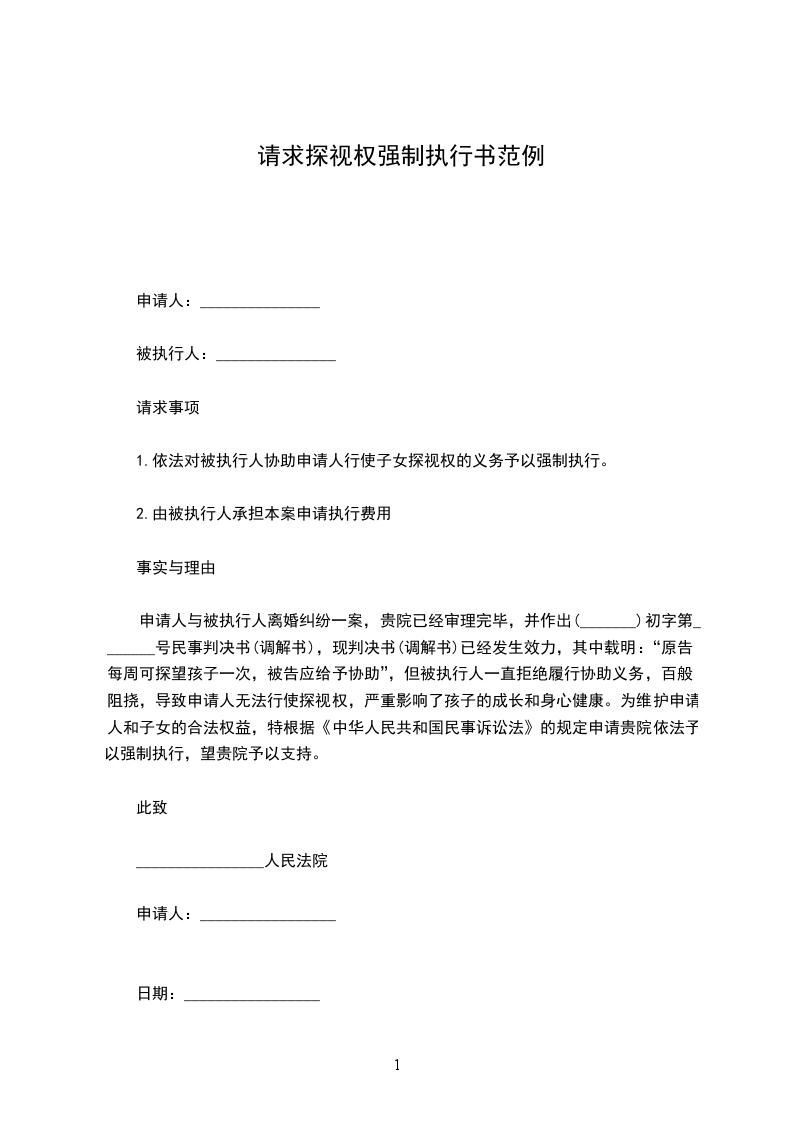 申请人与被执行人离婚纠纷一案,贵院已经审理完毕,并作出(______)初字第______号民事判决书(调解书),现判决书(调解书)已经发生效力,其中载明:“原告李每周可探望孩子一次,被告王应给予协助”,但被执行人一直拒绝履行协助义务,百般阻挠,导致申请人无法行使探视权,严重影响了孩子的成长和身心健康。为维护申请人和子女的合法权益,特根据《中华人民共和国民事诉讼法》的规定申请贵院依法予以强制执行,望贵院予以支持。