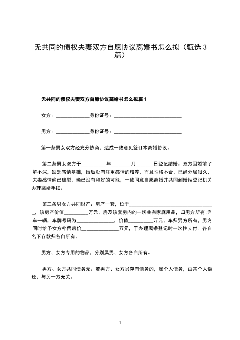无共同的债权夫妻双方自愿协议离婚书怎么拟篇3