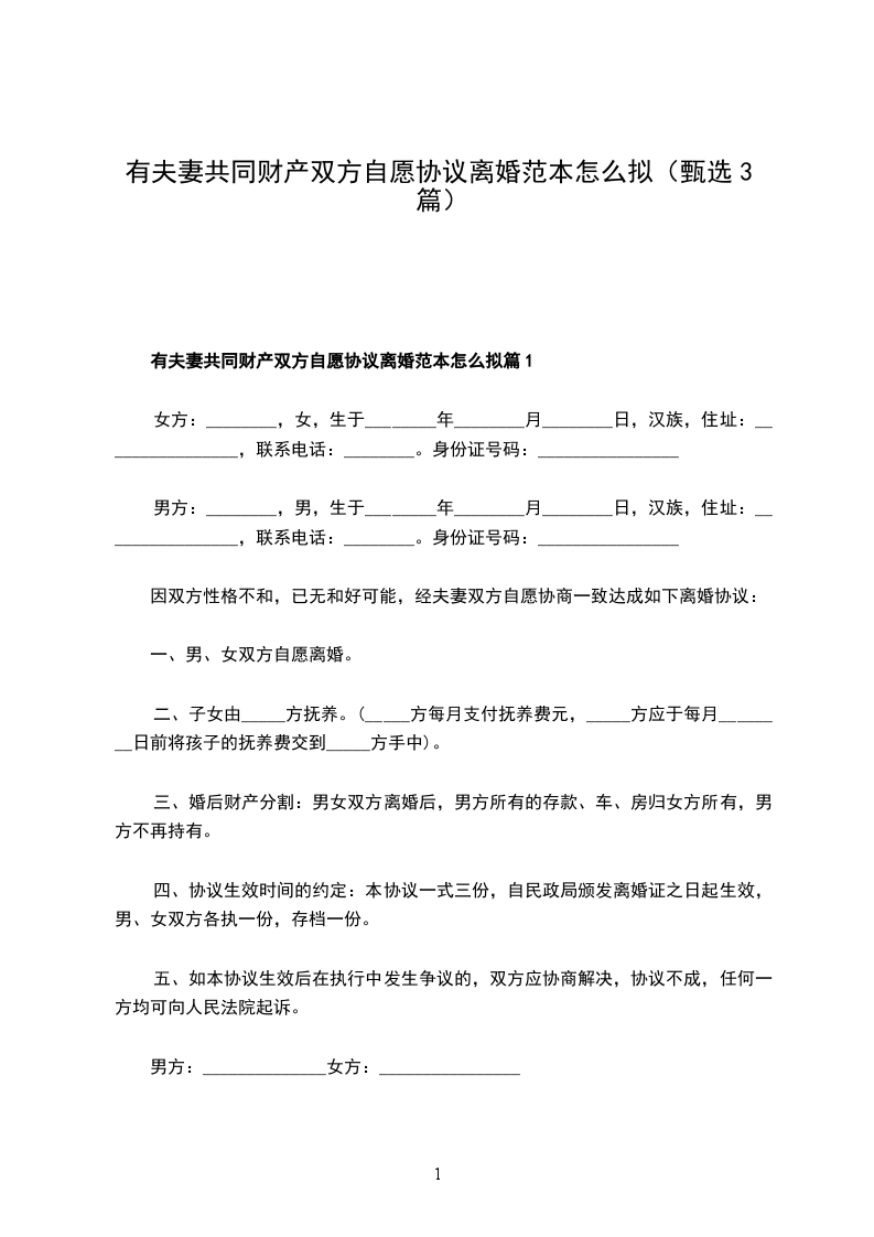 第一条男女双方经充分协商,达成一致意见签订本离婚协议。