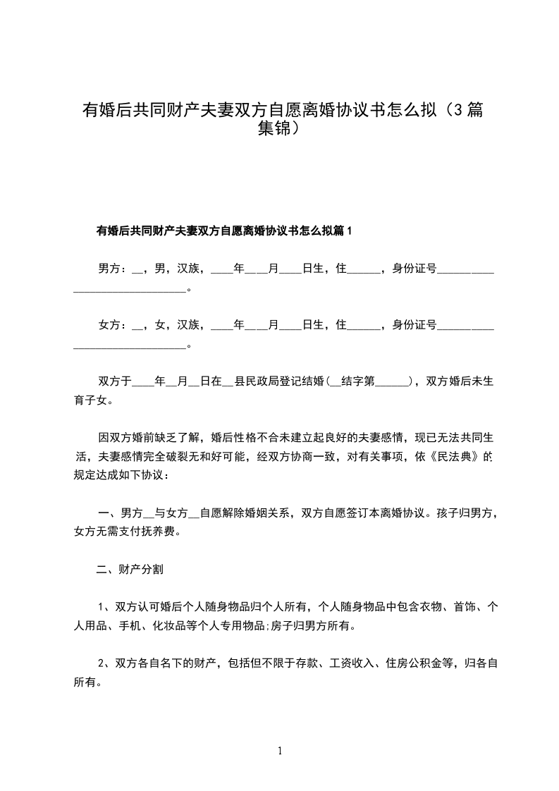 有婚后共同财产双方自愿协议离婚书格式篇3