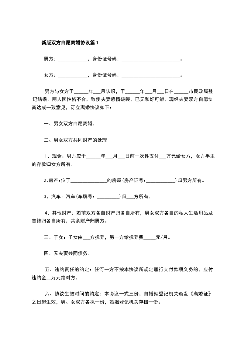 一、__________与__________自愿离婚。