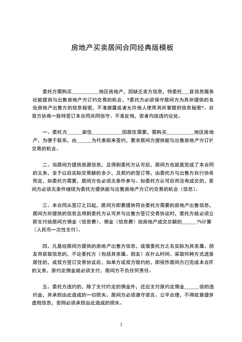 一、委托方______家住____________因居住需要,需购买___________地区房地产,为便于联系,由______为代表前来签约,要求居间方提供能与出售房地产方订约交易的机会。