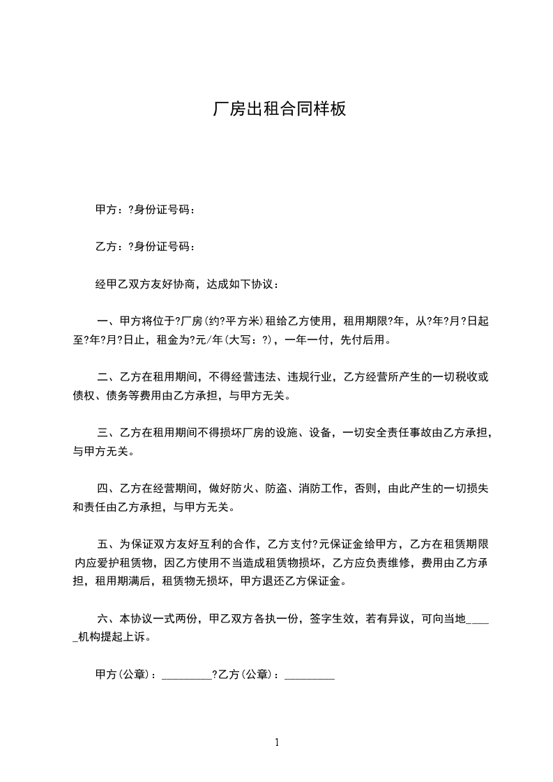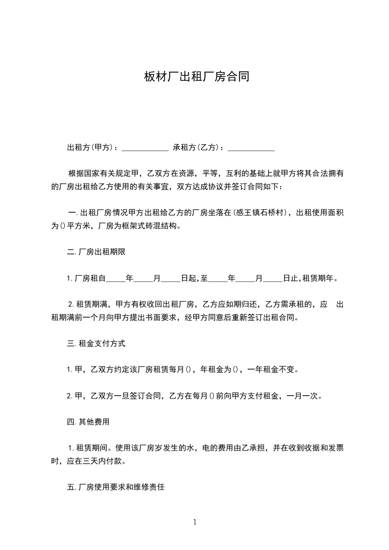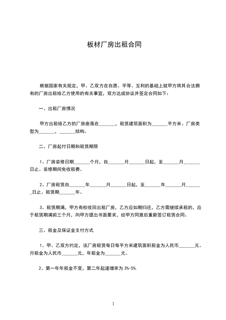 一、甲方将位于?厂房(约?平方米)租给乙方使用,租用期限?年,从?年?月?日起至?年?月?日止,租金为?元/年(大写:?),一年一付,先付后用。