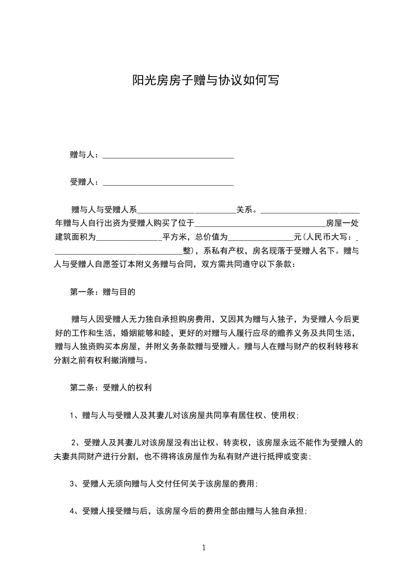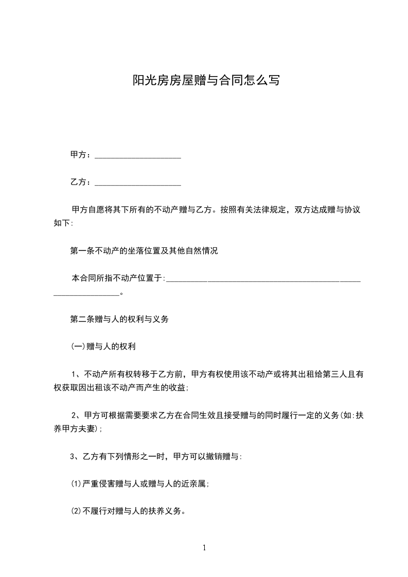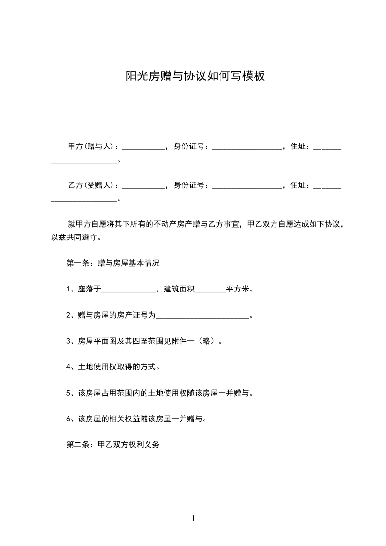 甲方自愿将其下房屋无偿赠与乙方。按照民法典等有关法律规定,双方自愿达成房屋赠与协议如下: