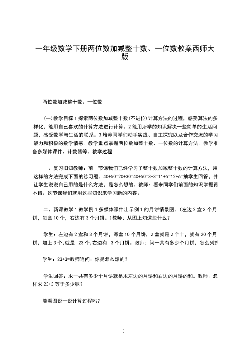 (一)教学目标1探索两位数加减整十数(不进位)计算方法的过程,感受算法的多样化,能用自己喜欢的计算方法进行计算。2能用所学的知识解决一些简单的生活问题,感受数学与生活的联系。3培养同学们动手实践、自主探究以及合作交流的学习能力和积极的数学情感。教学重点掌握两位数加整十数、一位数的计算方法。教学准备多媒体课件、计数器等。教学过程