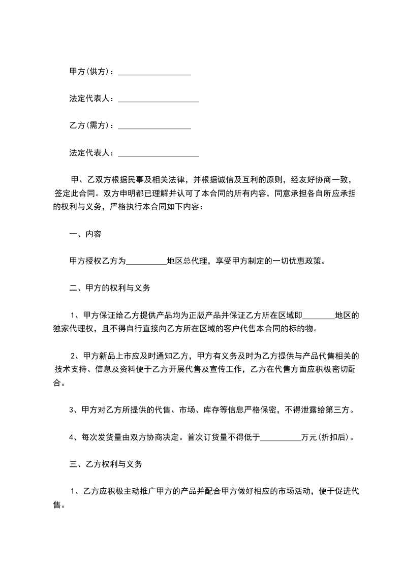 甲方授权乙方为__________地区总代理,享受甲方制定的一切优惠政策。