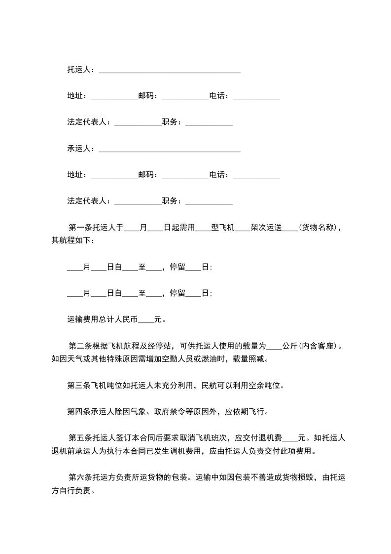 第五条托运人签订本合同后要求取消飞机班次,应交付退机费____元。如托运人退机前承运人为执行本合同已发生调机费用,应由托运人负责交付此项费用。