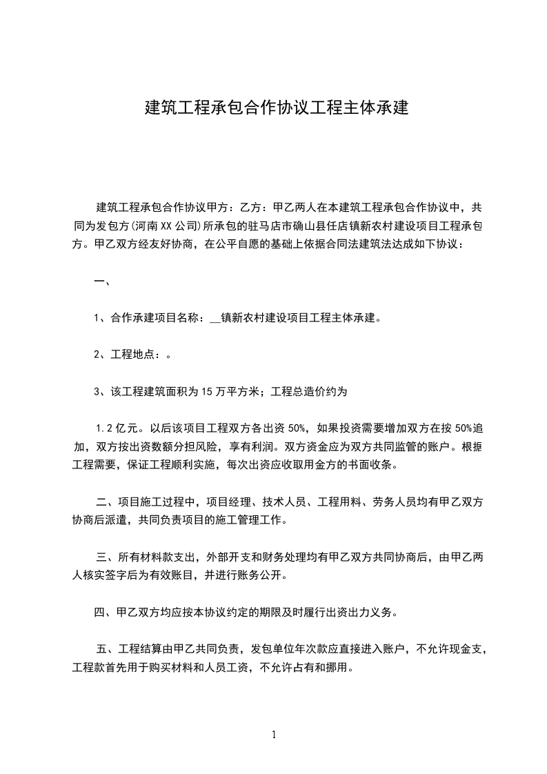建筑工程承包合作协议甲方:乙方:甲乙两人在本建筑工程承包合作协议中,共同为发包方(河南XX公司)所承包的驻马店市确山县任店镇新农村建设项目工程承包方。甲乙双方经友好协商,在公平自愿的基础上依据合同法建筑法达成如下协议: