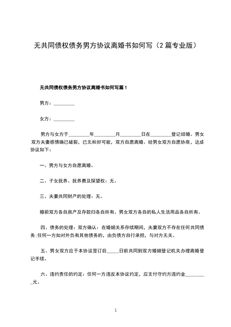 无共同债权债务男方协议离婚书如何写篇2