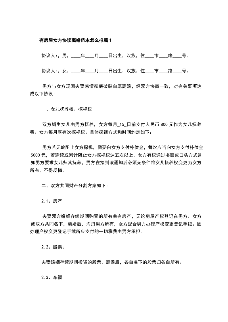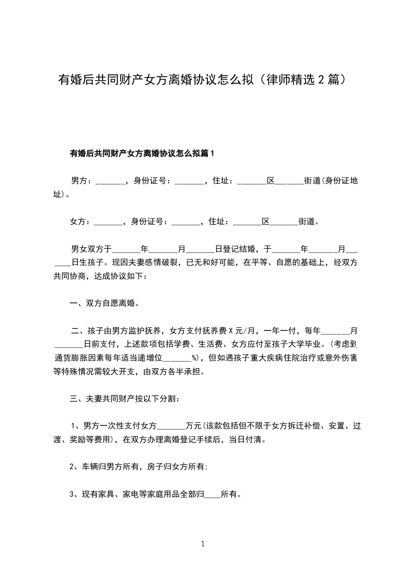 有婚后共同财产女方协议离婚书怎么拟篇2