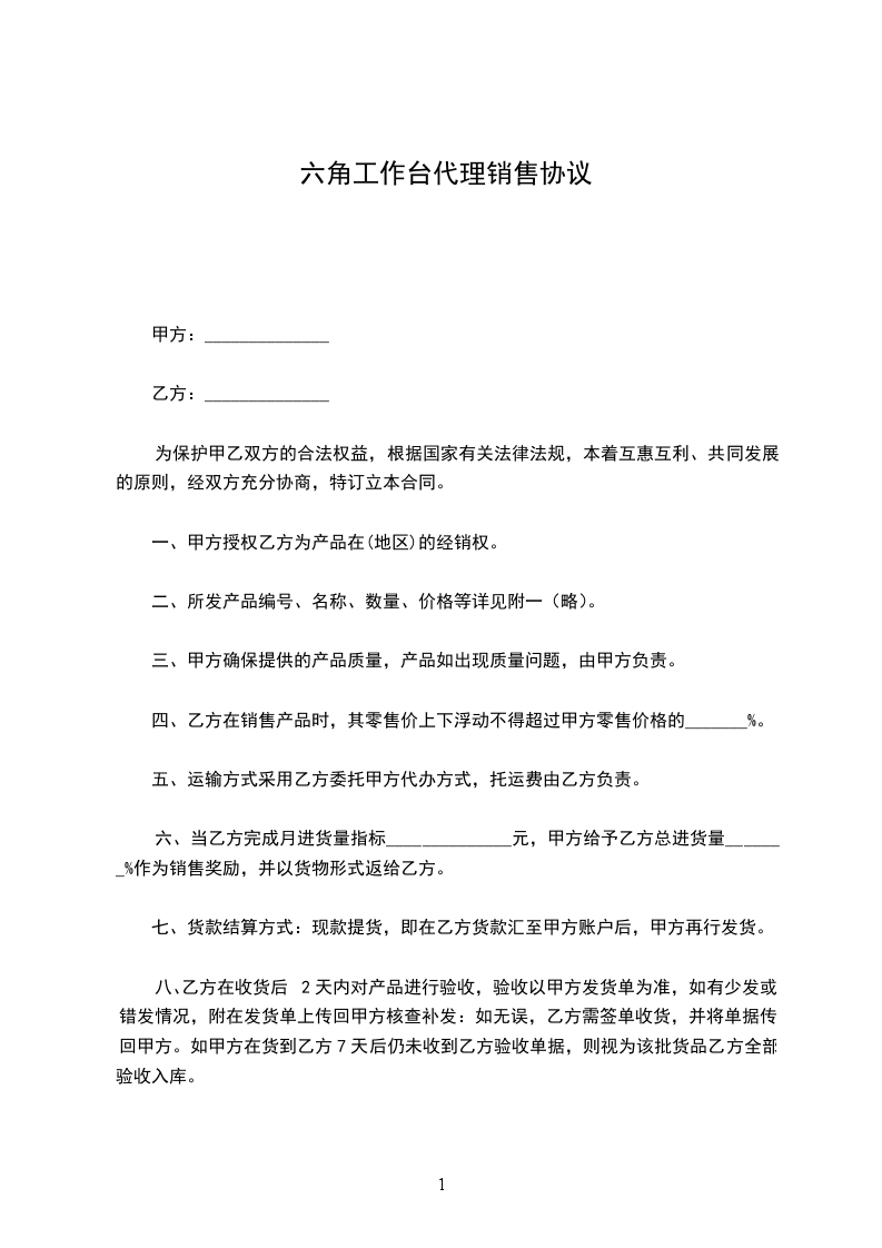 六、当乙方完成月进货量指标______________元,甲方给予乙方总进货量_______%作为销售奖励,并以货物形式返给乙方。