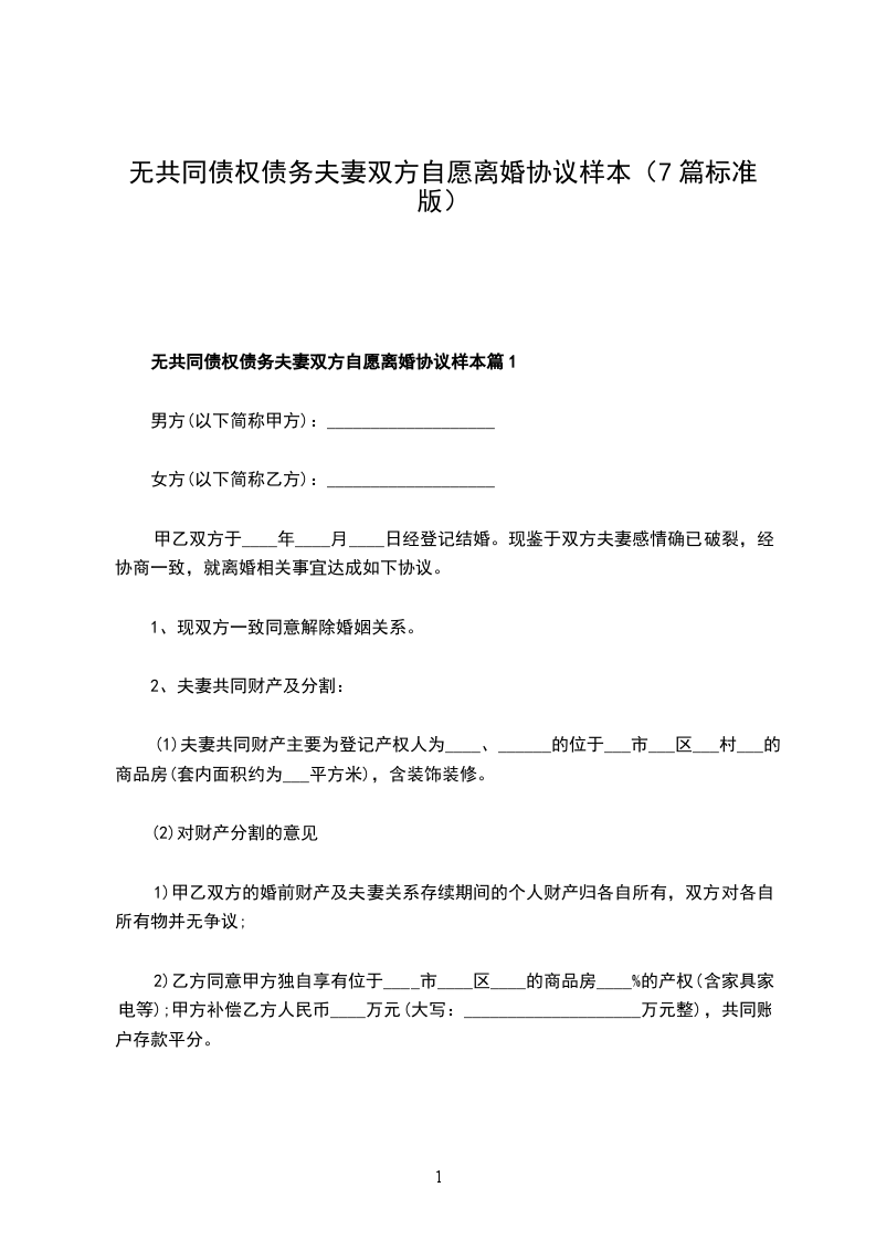 无共同债权债务夫妻双方自愿离婚协议样本篇7