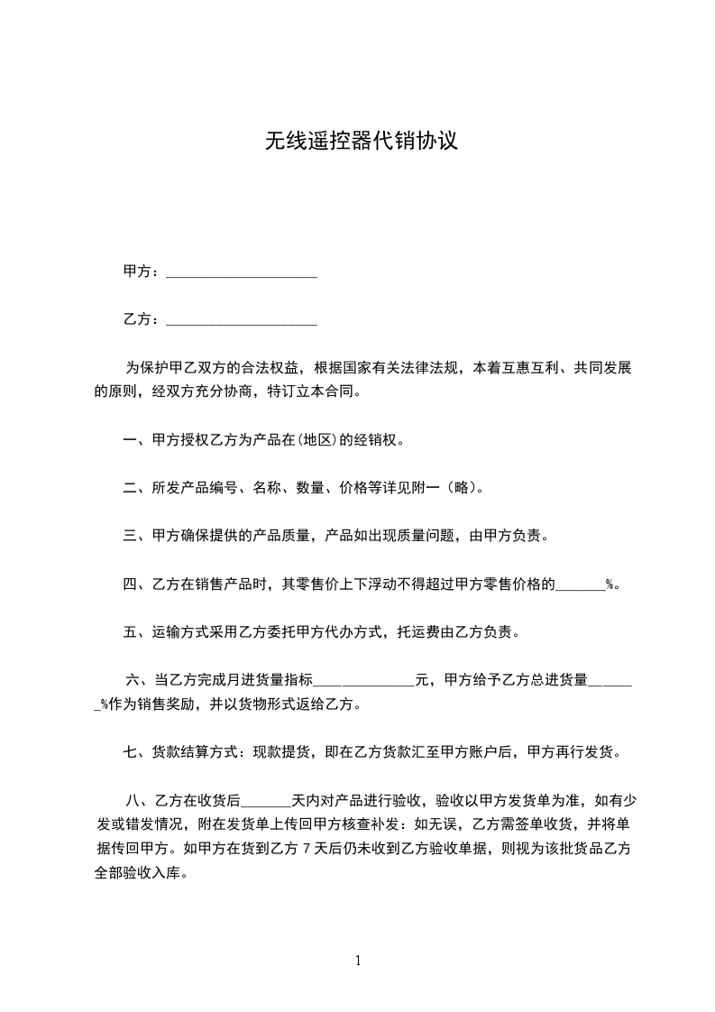 六、当乙方完成月进货量指标______________元,甲方给予乙方总进货量_______%作为销售奖励,并以货物形式返给乙方。