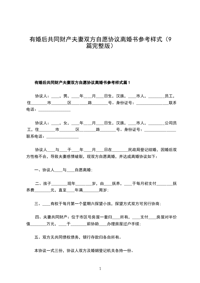 有婚后共同财产夫妻双方自愿协议离婚书参考样式篇9