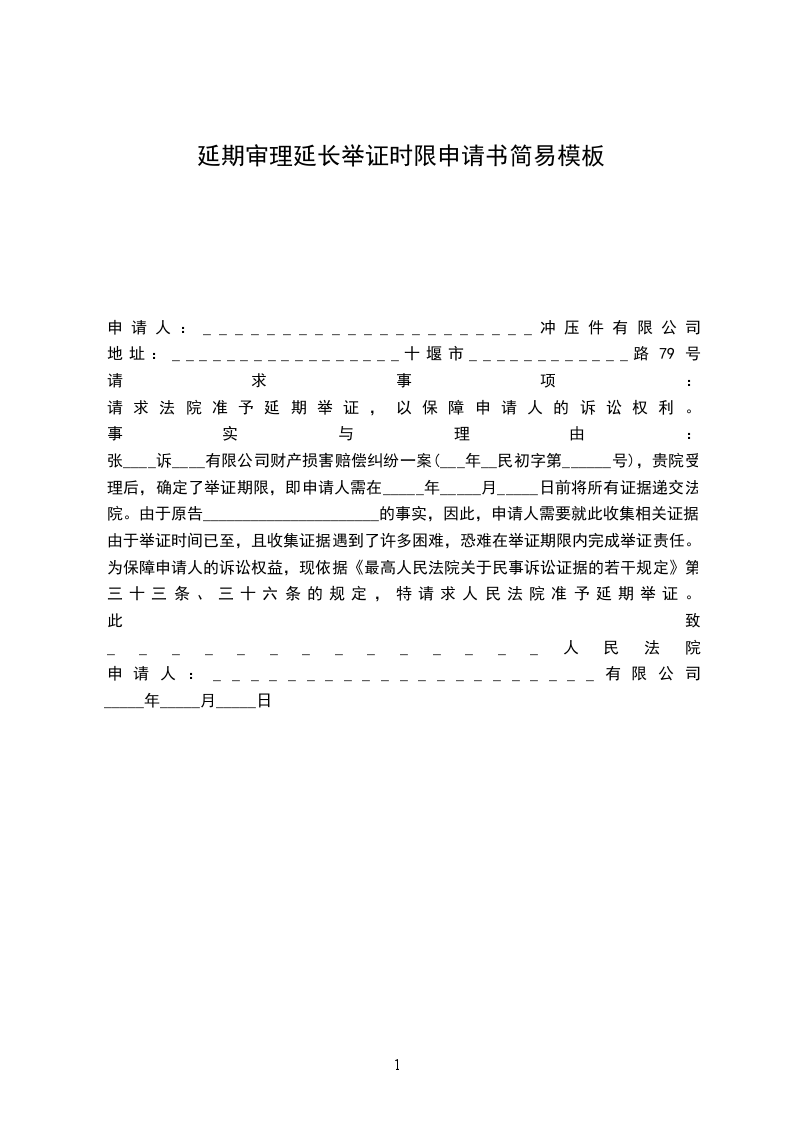 张____诉____有限公司财产损害赔偿纠纷一案(___年__民初字第______号),贵院受理后,确定了举证期限,即申请人需在_____年_____月_____日前将所有证据递交法院。由于原告______________________的事实,因此,申请人需要就此收集相关证据。由于举证时间已至,且收集证据遇到了许多困难,恐难在举证期限内完成举证责任。为保障申请人的诉讼权益,现依据《最高人民法院关于民事诉讼证据的若干规定》第三十三条、三十六条的规定,特请求人民法院准予延期举证。