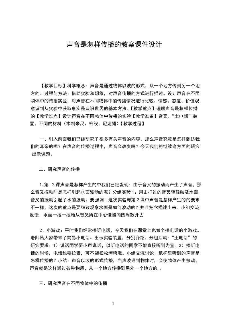 二、教学课题过程与方法1能够对声音在物体中的传播方向作出假设,并设计相应的实验,找到问题的答案。2会按步骤实施实验计划,仔细观察,认真比较。科学知识1通过实验知道声音能在沙、水、空气或其他物质中传播。2学会制作土电话,使用土电话玩通话游戏。知道土电话是通过固体(线)传声的。情感态度与价值观1理解观察、实验假设、资料在科学研究中具有重要的意义。2理解科学与生活有着紧密的联系。3学习安静地做声学实验。