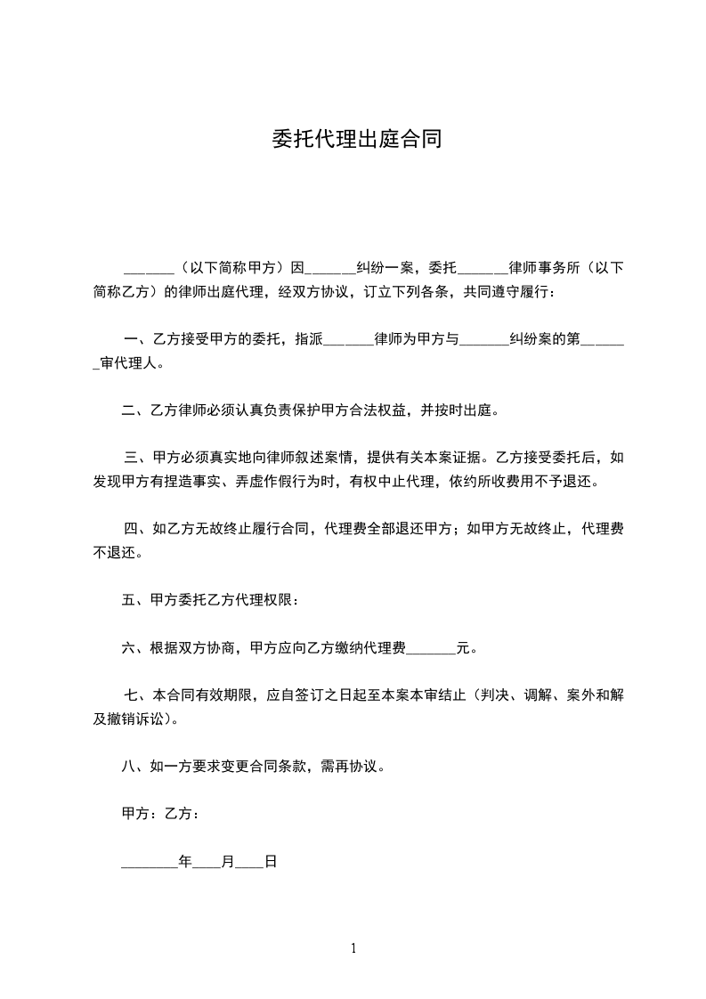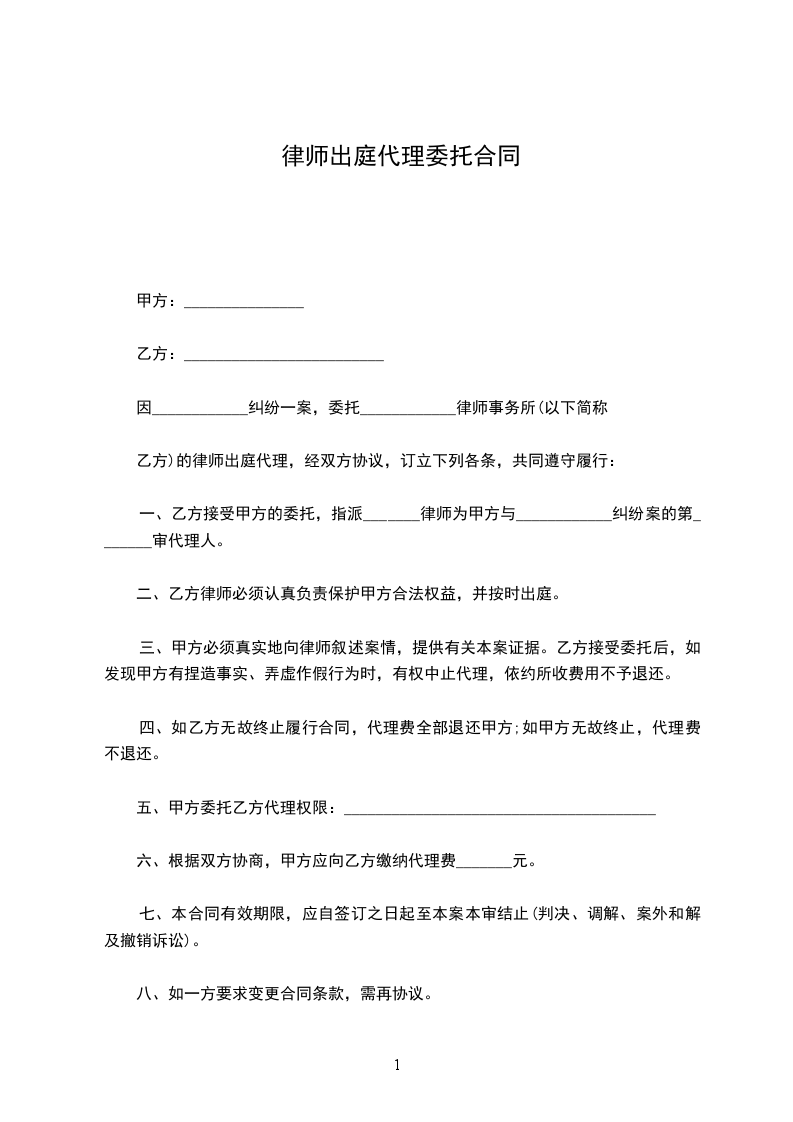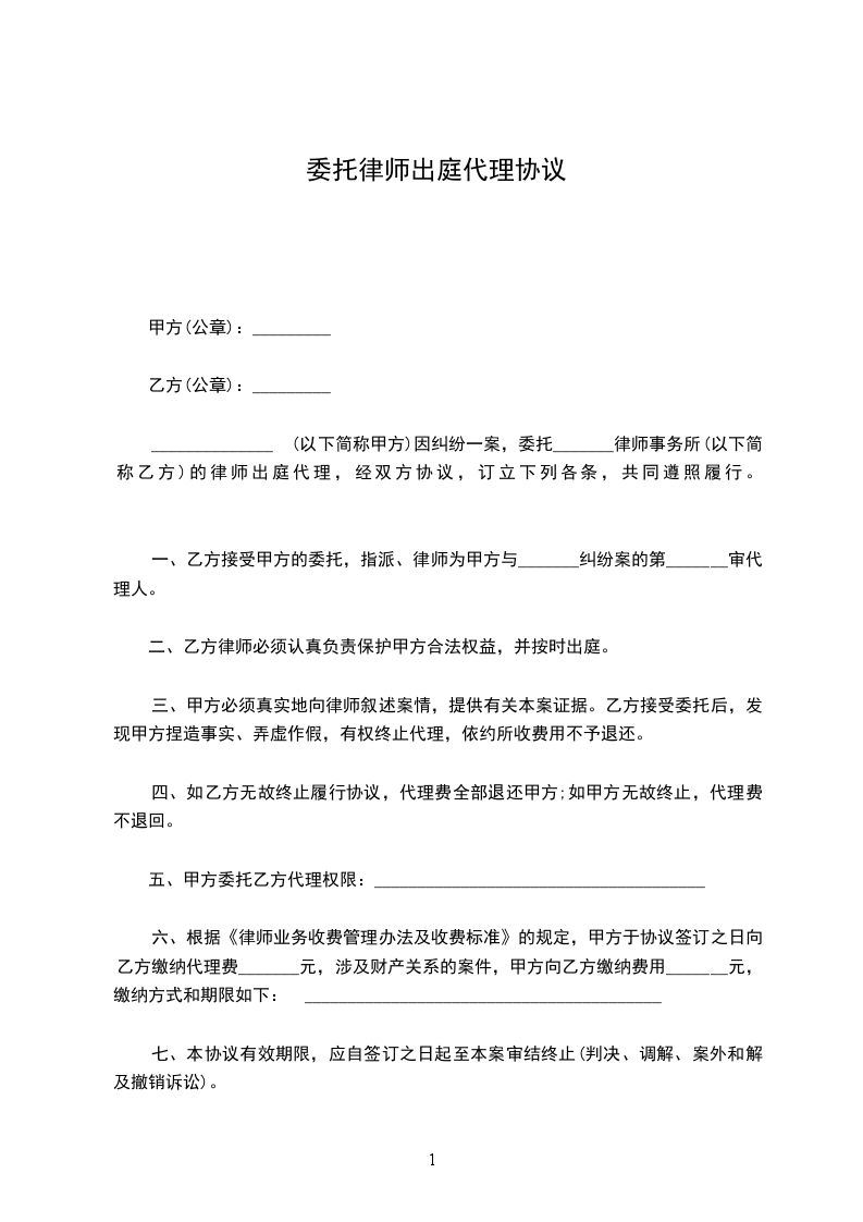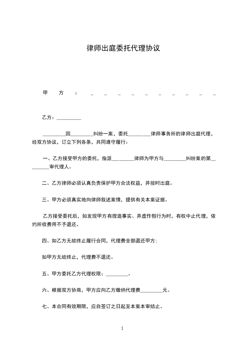 _______(以下简称甲方)因_______纠纷一案,委托_______律师事务所(以下简称乙方)的律师出庭代理,经双方协议,订立下列各条,共同遵守履行: