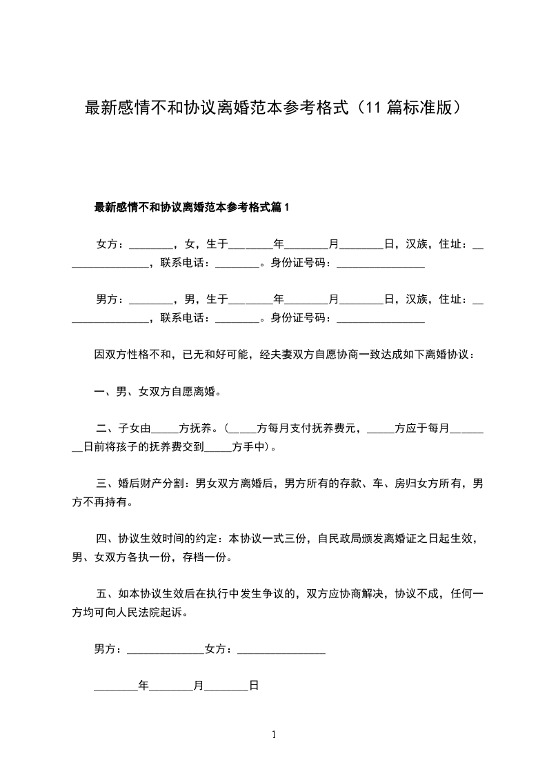 最新感情不和协议离婚范本参考格式篇11