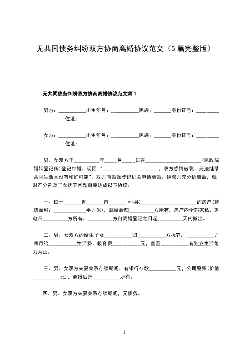 无共同债务纠纷双方协商离婚协议书参考样例篇5
