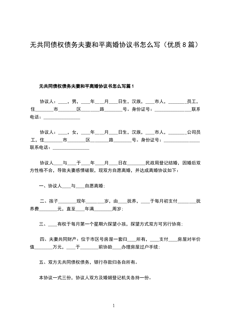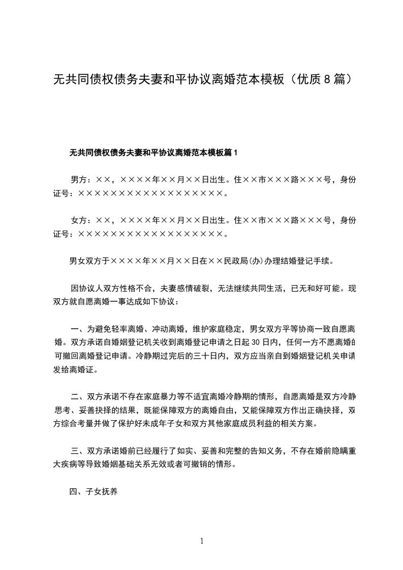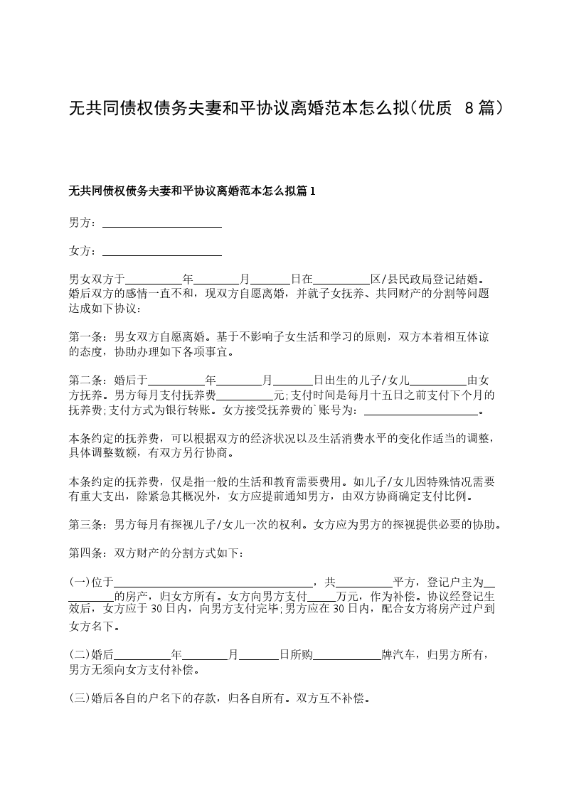 无共同债权债务夫妻和平离婚协议参考样例篇8
