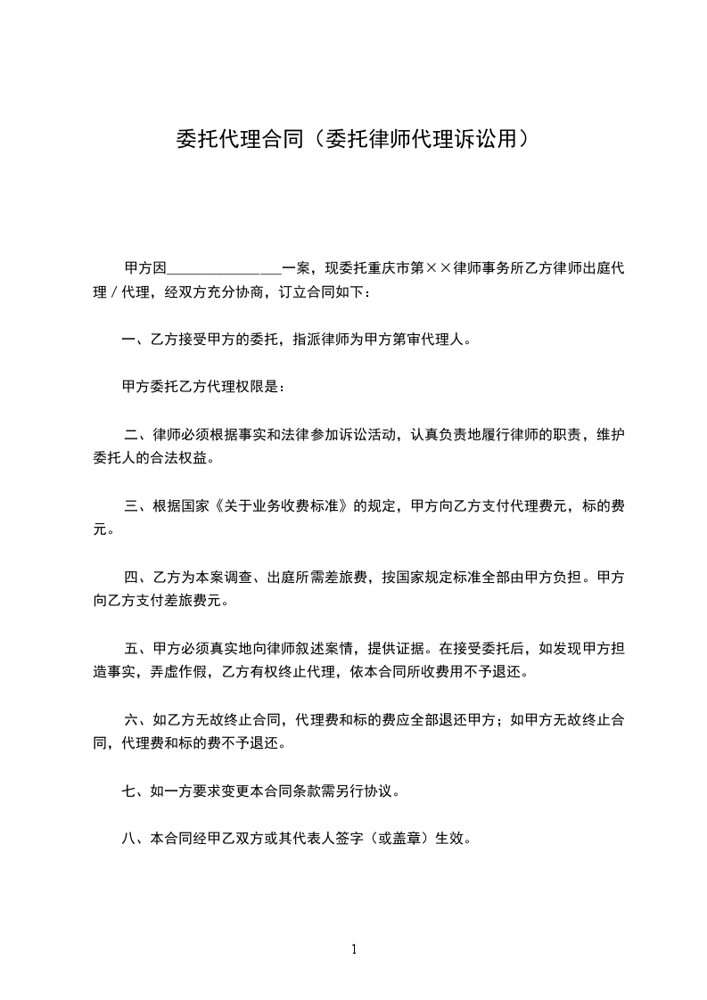 甲方因________________一案,现委托重庆市第××律师事务所乙方律师出庭代理/代理,经双方充分协商,订立合同如下:
