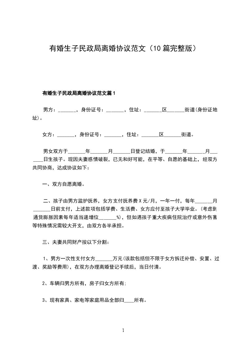 男方与女方于______年____月相识,并于______年____月____日在_________民政局登记结婚,婚后于______年____月____日生育一儿子,名_________。因____________________________致使夫妻双方感情破裂,且已无任何和好可能,现经双方自愿协商达成一致意见,订立离婚协议如下:
