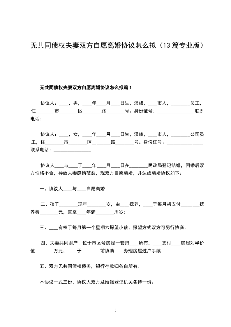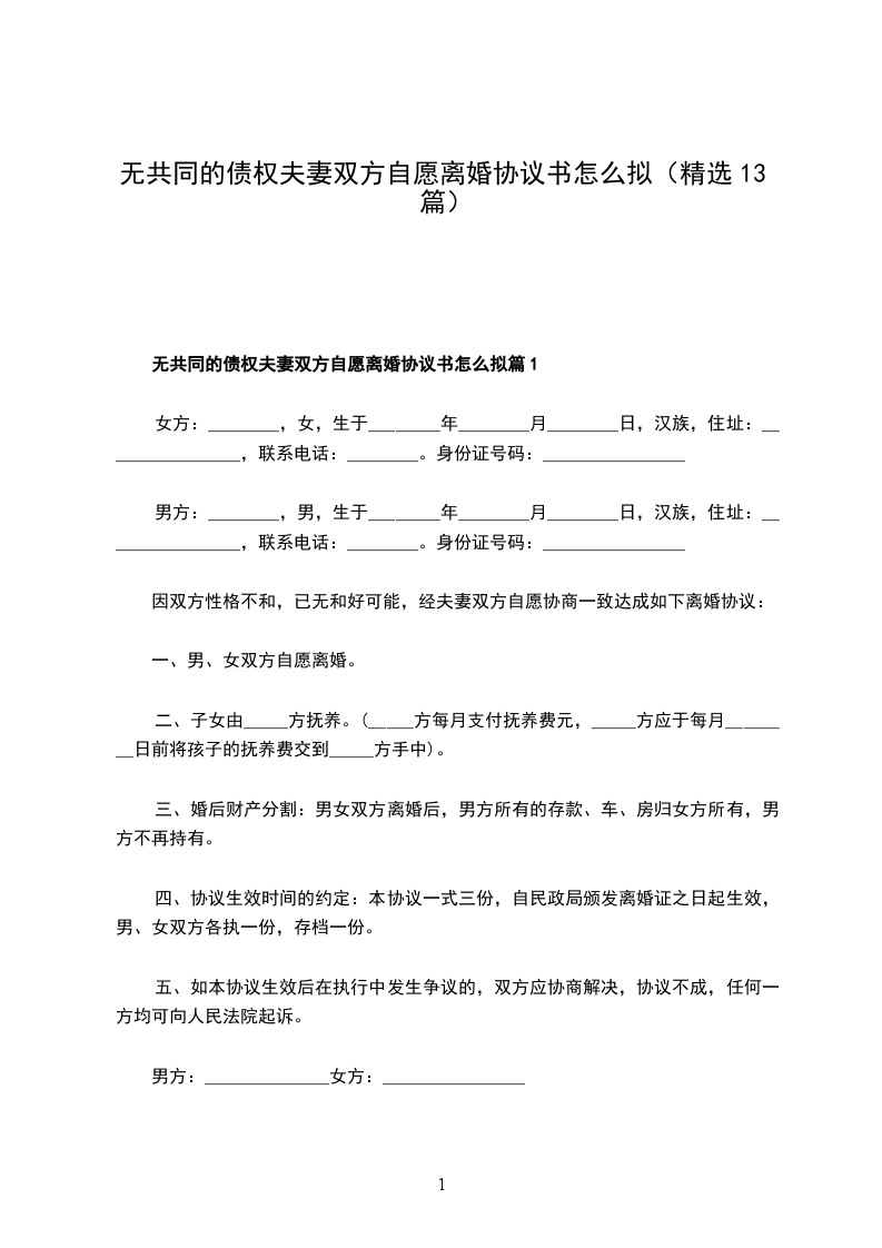 无共同债权夫妻双方自愿离婚协议书怎么拟篇13