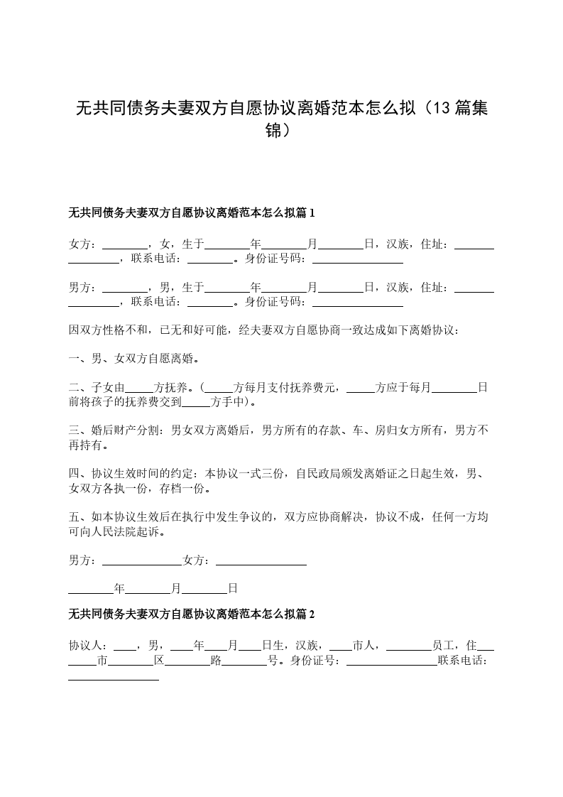 无共同债权夫妻双方自愿离婚协议书怎么拟篇9