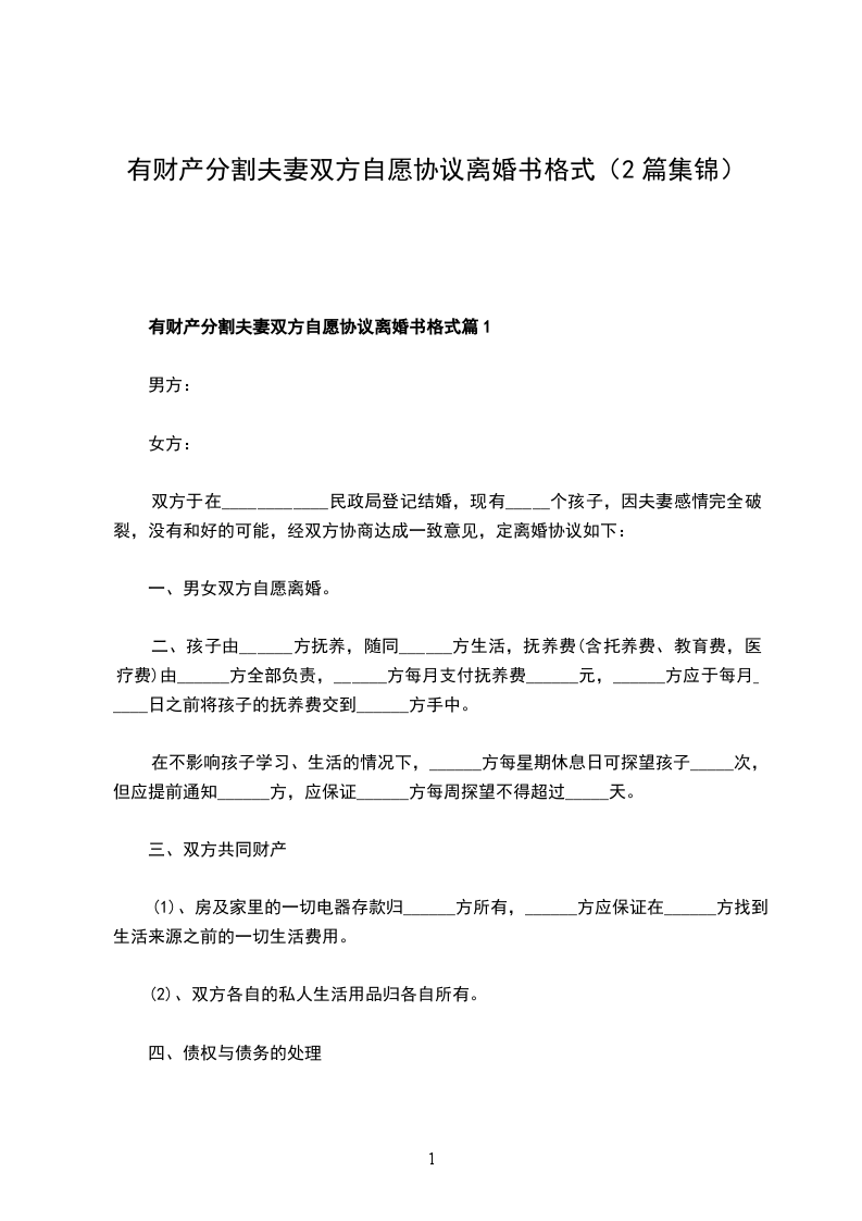 有财产分割夫妻双方自愿协议离婚书格式篇1