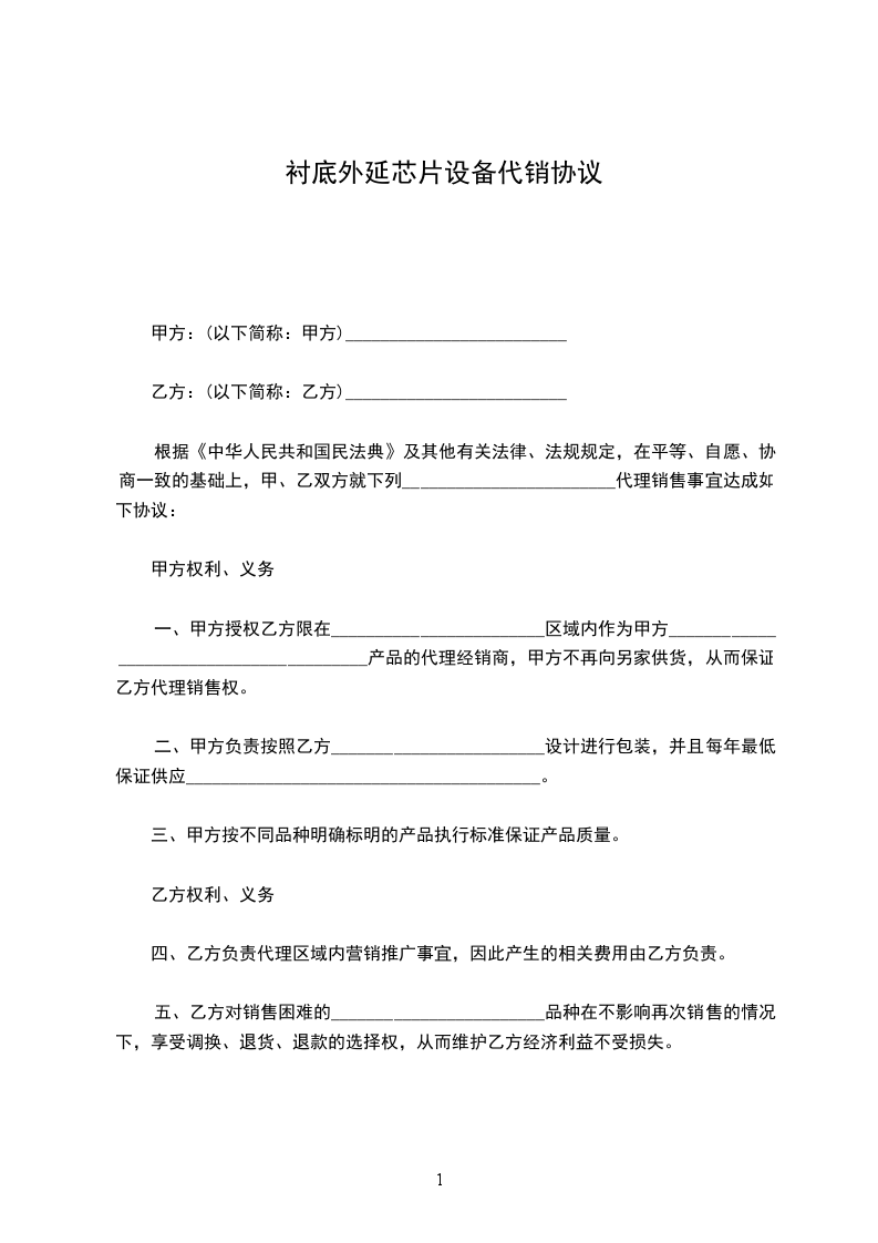 ___________________是______________________________经销总代理商,现因市场发展需要,经甲乙双方协商一致,甲方同意授权乙方作为甲方地区(省级、地级、县级)该产品的唯一代理商,销售地域为_______________范围内。并约定以下条款互相遵守: