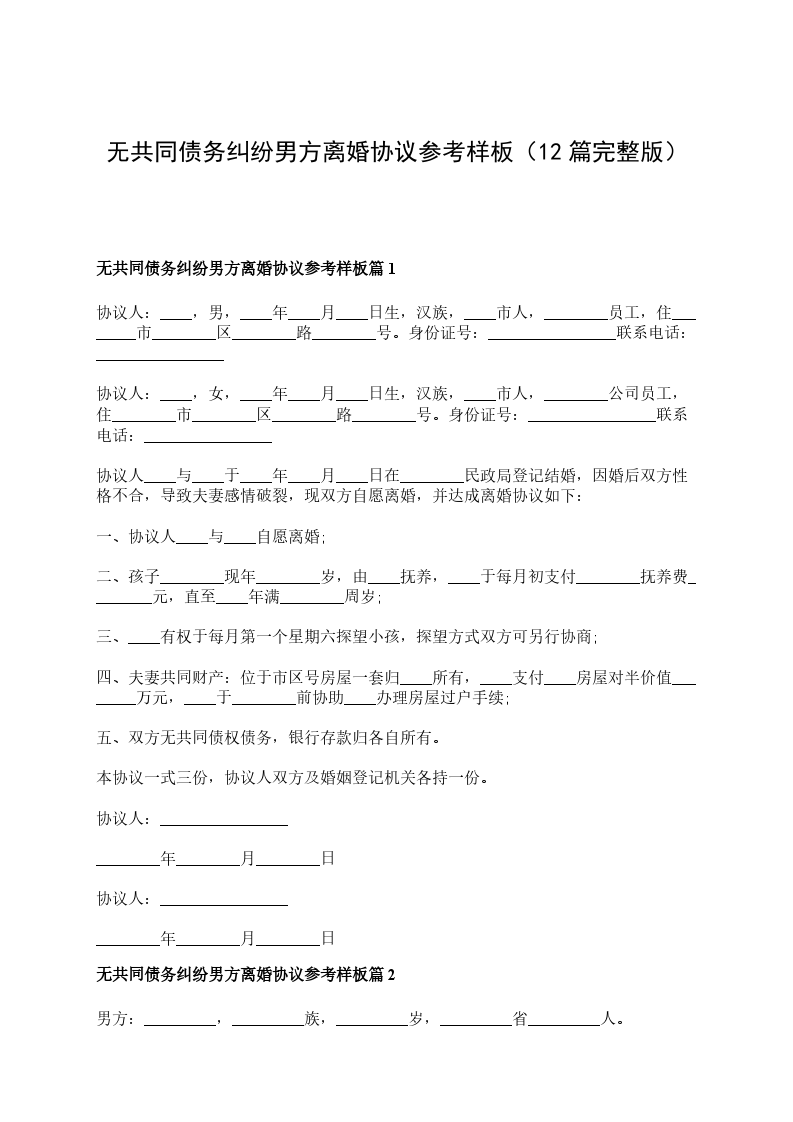 无共同债务纠纷男方离婚协议参考样板篇12
