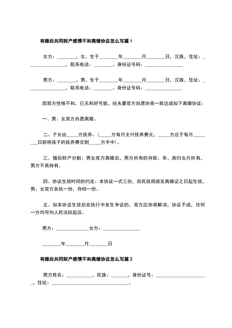 有婚后共同财产感情不和离婚协议怎么写篇3