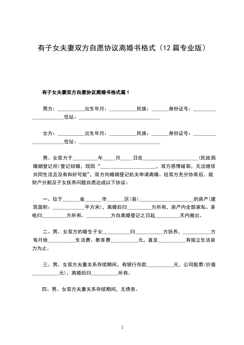 本协议书系双方真实意思表示,上述内容全部真实有效,一旦提供虚假情况,双方当事人自愿承担一切法律后果。本协议书一式____份,婚姻登记机关存档____份,双方各执____份,双方签字,并经婚姻登记机关办理离婚登记后生效。
