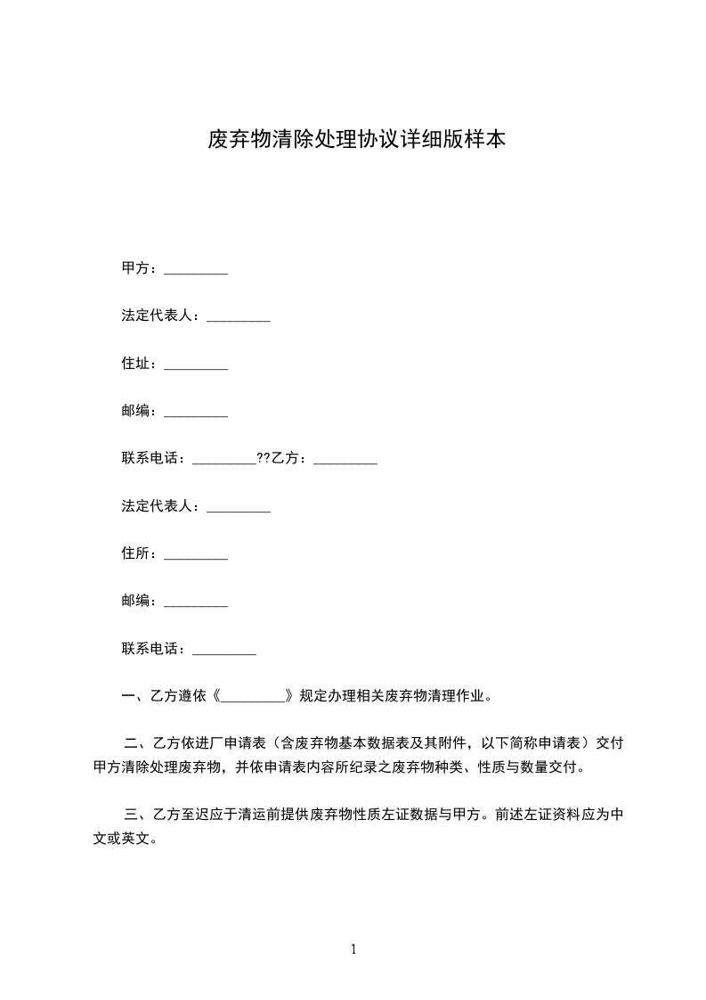 (一)乙方应详实告知甲方拟清除处理之废弃物种类与性质。若因乙方未详实告知,经甲方清除发现者,该批废弃物退还乙方。