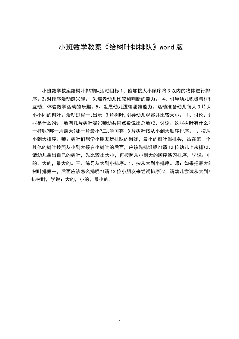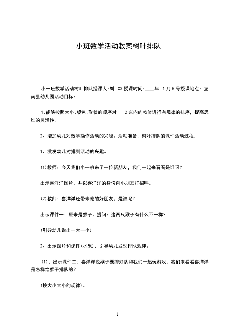 小一班数学活动树叶排队授课人:刘XX授课时间:____年1月5号授课地点:龙南县幼儿园活动目标: