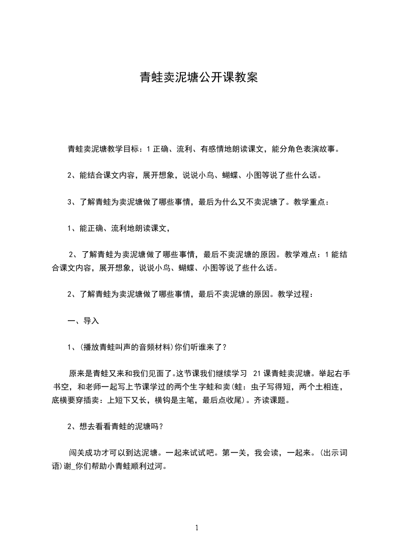 青蛙卖泥塘教学目标:1正确、流利、有感情地朗读课文,能分角色表演故事。