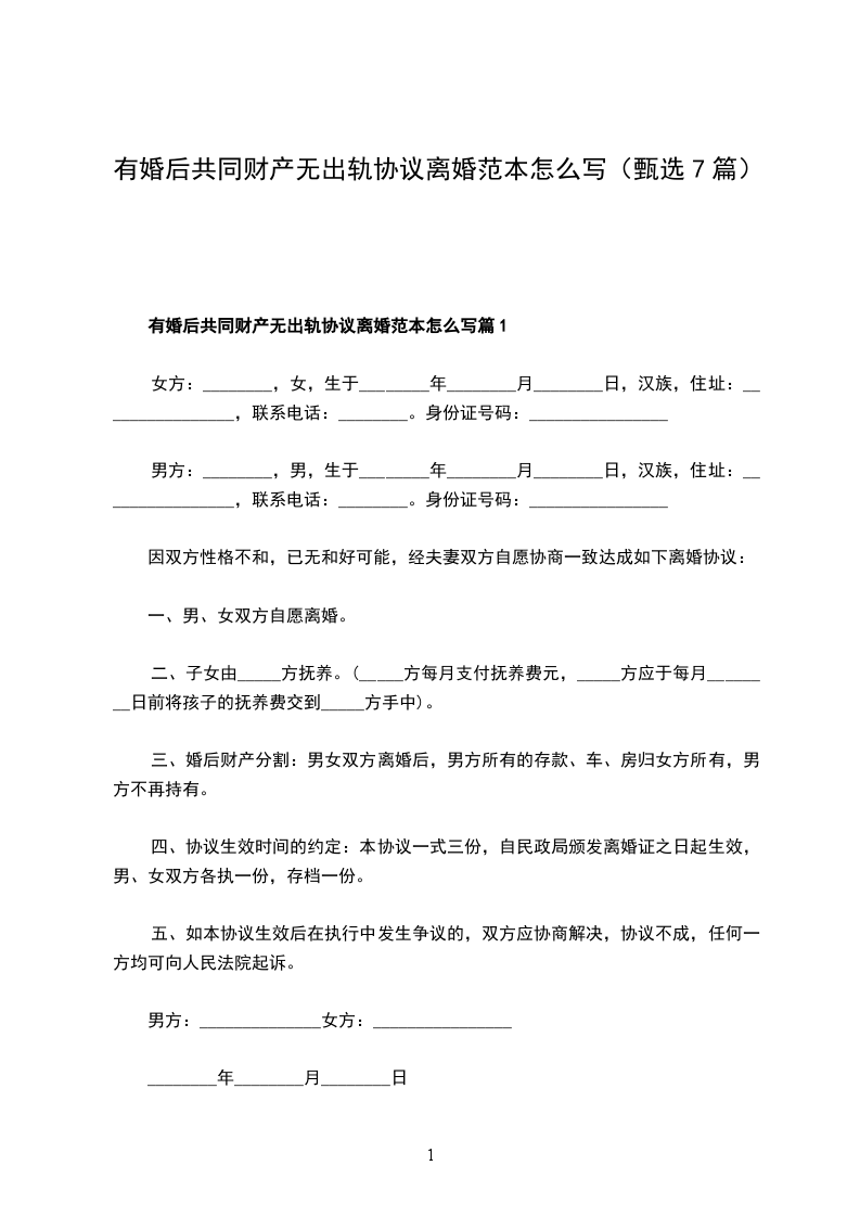 有婚后共同财产无出轨协议离婚范本怎么写篇7