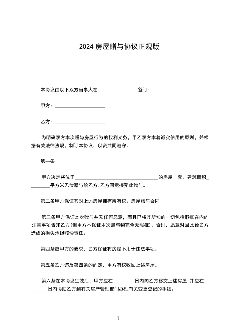一、甲方将其所有的______(标的物)赠送给乙方,其所有权证明为:(写明证明甲方拥有所有权的证据名称,如赠与房屋,就应有房产所有权证,赠与微机应有购买该微机的发票等)