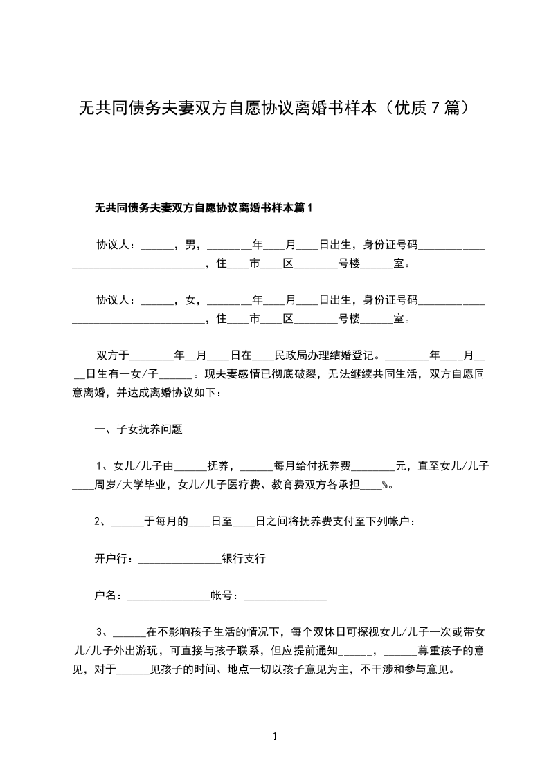 本协议书系双方真实意思表示,上述内容全部真实有效,一旦提供虚假情况,双方当事人自愿承担一切法律后果。本协议书一式____份,婚姻登记机关存档____份,双方各执____份,双方签字,并经婚姻登记机关办理离婚登记后生效。