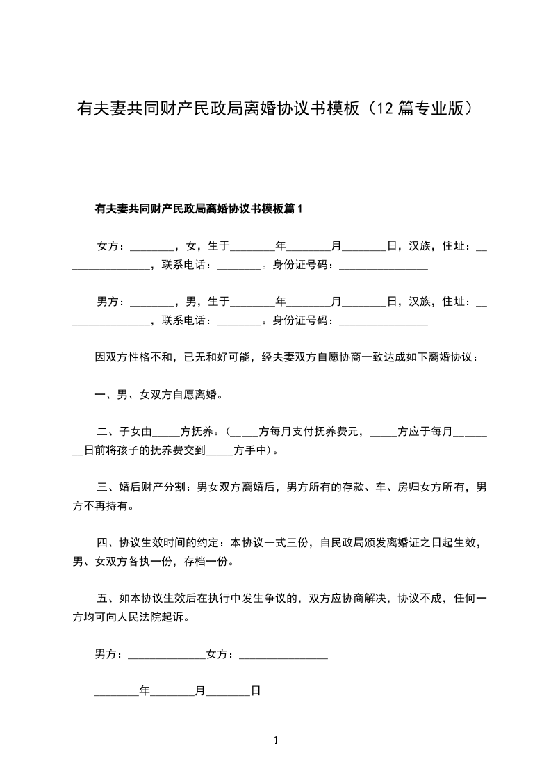 有夫妻共同财产民政局离婚协议模板篇12