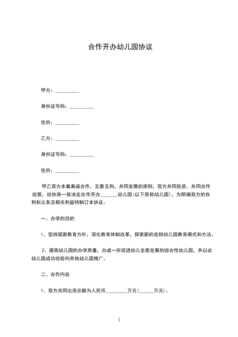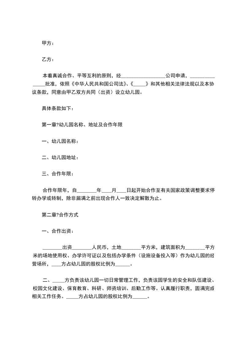 本着真诚合作、平等互利的原则,经__________________公司申请,_______________批准,依照《中华人民共和国公司法》、《_____》和其他相关法律法规以及本协议条款,同意由甲乙双方共同(出资)设立幼儿园。