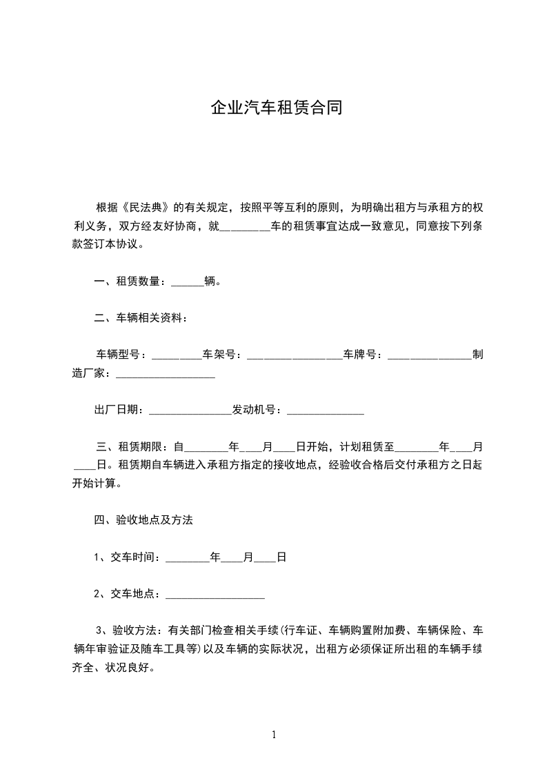根据《民法典》的有关规定,按照平等互利的原则,为明确出租方与承租方的权利义务,双方经友好协商,就_________车的租赁事宜达成一致意见,同意按下列条款签订本协议。