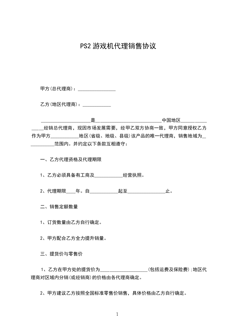 _____________________是____________________________中国地区________________经销总代理商,现因市场发展需要,经甲乙双方协商一致,甲方同意授权乙方作为甲方____________地区(省级、地级、县级)该产品的唯一代理商,销售地域为____________范围内。并约定以下条款互相遵守: