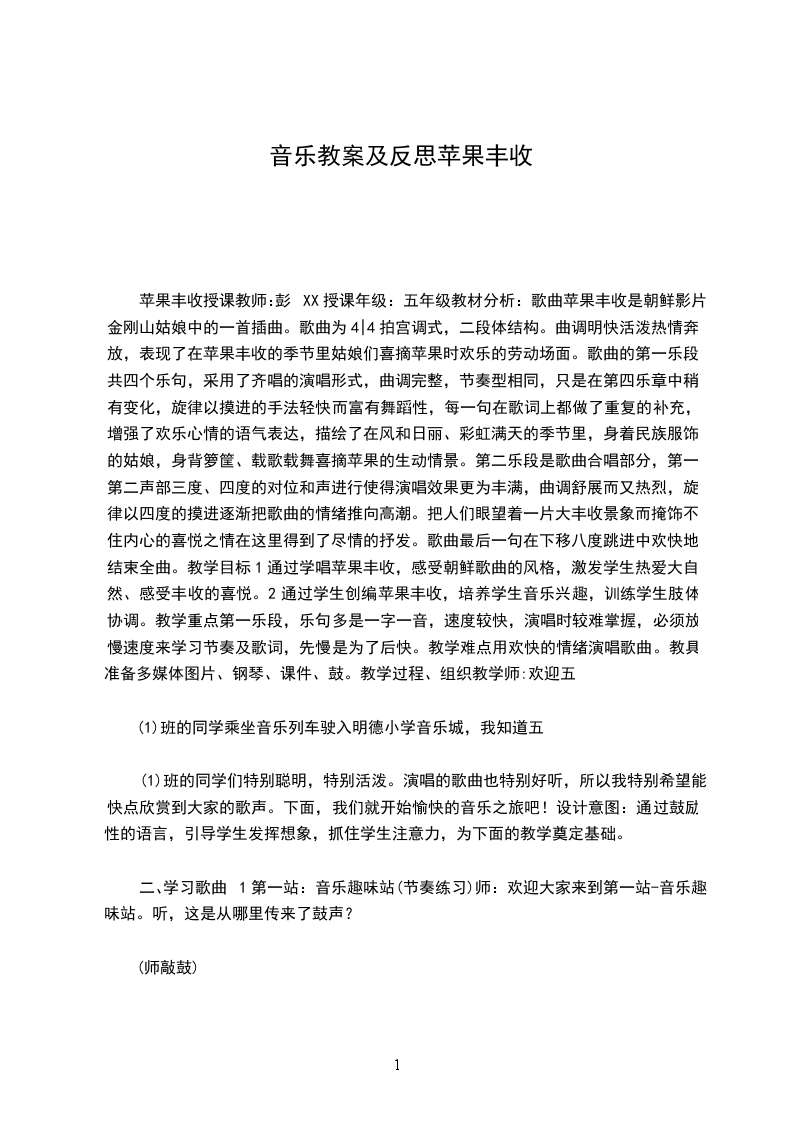 六、教学反思这首歌曲表现了朝鲜人民在苹果丰收时的喜悦心情,因此,速度较快,尤其是第一乐段,一字一音。所以必需唱得非常流畅,才能表达这种喜悦的情感。在范唱时使学生感受作品的整体情绪效果后,必需放慢速度让学生来学习旋律与歌词。通过这节课的教学来看,五年级的学生已经有能力去进行初步的自学歌曲了,当然这也是要在老师的指引下完成的,而并不是学生完全自学。这应该就是我们所说的,强调了“以学生发展为本”的教育理念吧。本节课我也是从这点出发来考虑的课程安排,因为这首歌曲是一首朝鲜民歌,所以首先是进行反复听歌曲,让学生自己来感受歌曲的情感以及歌曲唱法上的区别,在这里学生们都很快的就能抓住歌曲情感上的主题思想。通过课件了解朝鲜得风土人情和文化特色,以及感受本歌曲的异国风格。在学生们抓住歌曲的特点之后便很快学会了演唱歌曲。在这部分的学习中我的教学设计上有些不足,没能想出一个巧妙的办法让学生演唱时达到和谐的效果,在此还有待经验的吸取和教学的磨练,并且要以学生为主体,以培养学生创新、实践能力为目标的新型教学模式。