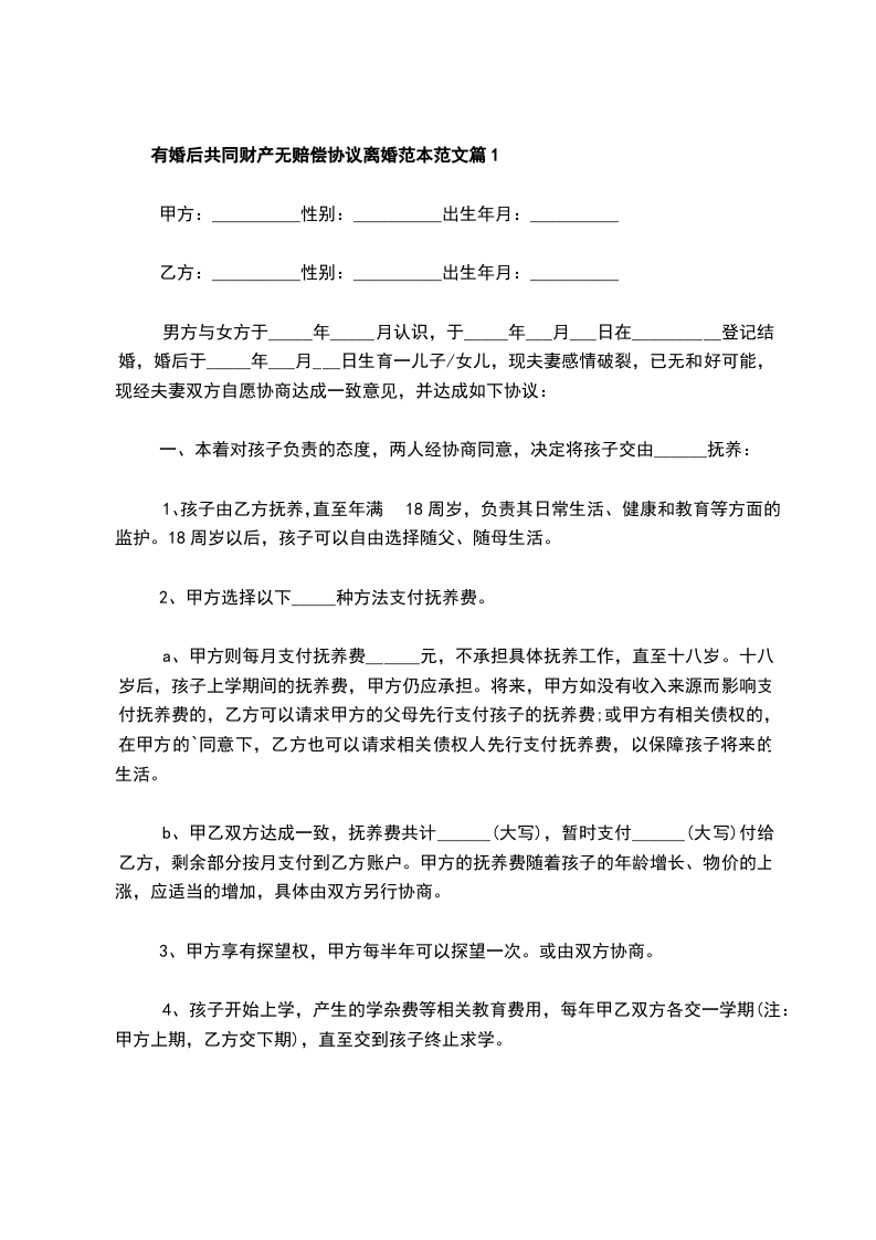 有婚后共同财产无赔偿协议离婚范本范文篇1