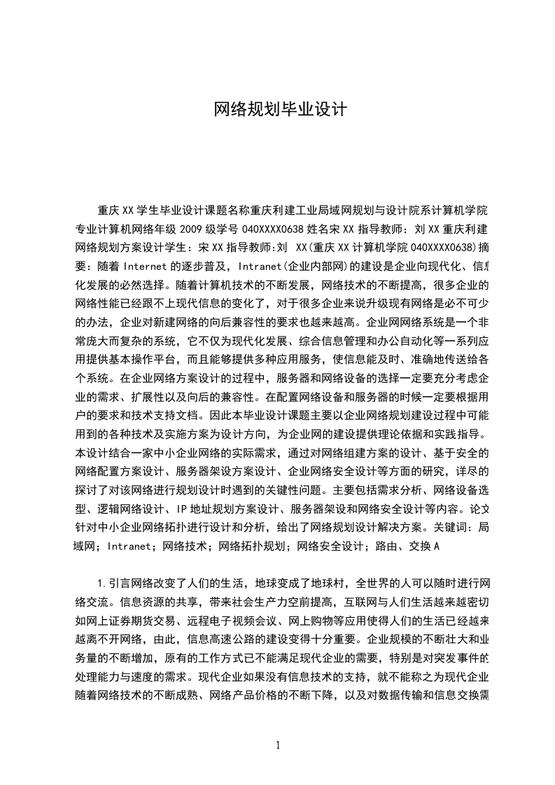 重庆XX学生毕业设计课题名称重庆利建工业局域网规划与设计院系计算机学院专业计算机网络年级2009级学号040XXXX0638姓名宋XX指导教师:刘XX重庆利建网络规划方案设计学生:宋XX指导教师:刘XX(重庆XX计算机学院040XXXX0638)摘要:随着Internet的逐步普及,Intranet(企业内部网)的建设是企业向现代化、信息化发展的必然选择。随着计算机技术的不断发展,网络技术的不断提高,很多企业的网络性能已经跟不上现代信息的变化了,对于很多企业来说升级现有网络是必不可少的办法,企业对新建网络的向后兼容性的要求也越来越高。企业网网络系统是一个非常庞大而复杂的系统,它不仅为现代化发展、综合信息管理和办公自动化等一系列应用提供基本操作平台,而且能够提供多种应用服务,使信息能及时、准确地传送给各个系统。在企业网络方案设计的过程中,服务器和网络设备的选择一定要充分考虑企业的需求、扩展性以及向后的兼容性。在配置网络设备和服务器的时候一定要根据用户的要求和技术支持文档。因此本毕业设计课题主要以企业网络规划建设过程中可能用到的各种技术及实施方案为设计方向,为企业网的建设提供理论依据和实践指导。本设计结合一家中小企业网络的实际需求,通过对网络组建方案的设计、基于安全的网络配置方案设计、服务器架设方案设计、企业网络安全设计等方面的研究,详尽的探讨了对该网络进行规划设计时遇到的关键性问题。主要包括需求分析、网络设备选型、逻辑网络设计、IP地址规划方案设计、服务器架设和网络安全设计等内容。论文针对中小企业网络拓扑进行设计和分析,给出了网络规划设计解决方案。关键词:局域网;Intranet;网络技术;网络拓扑规划;网络安全设计;路由、交换A