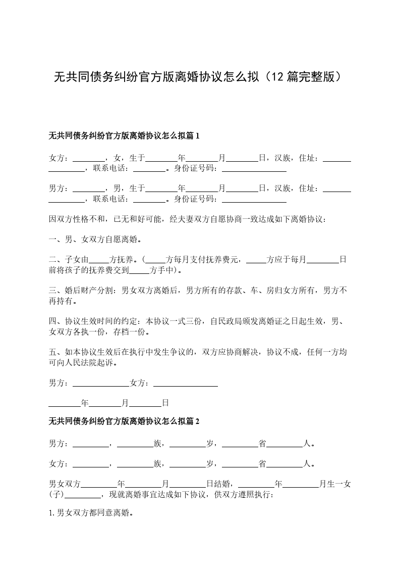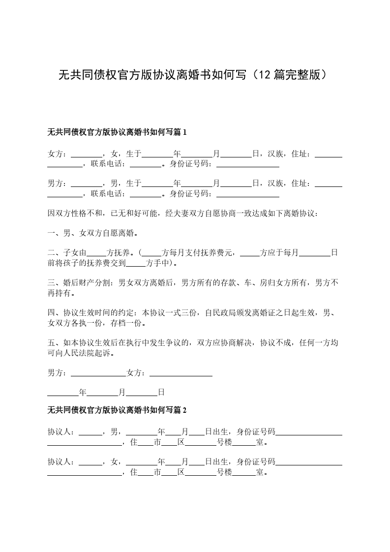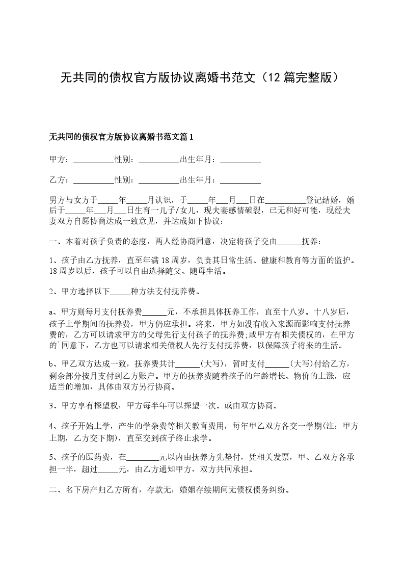 无共同债权官方版离婚协议书参考格式篇12