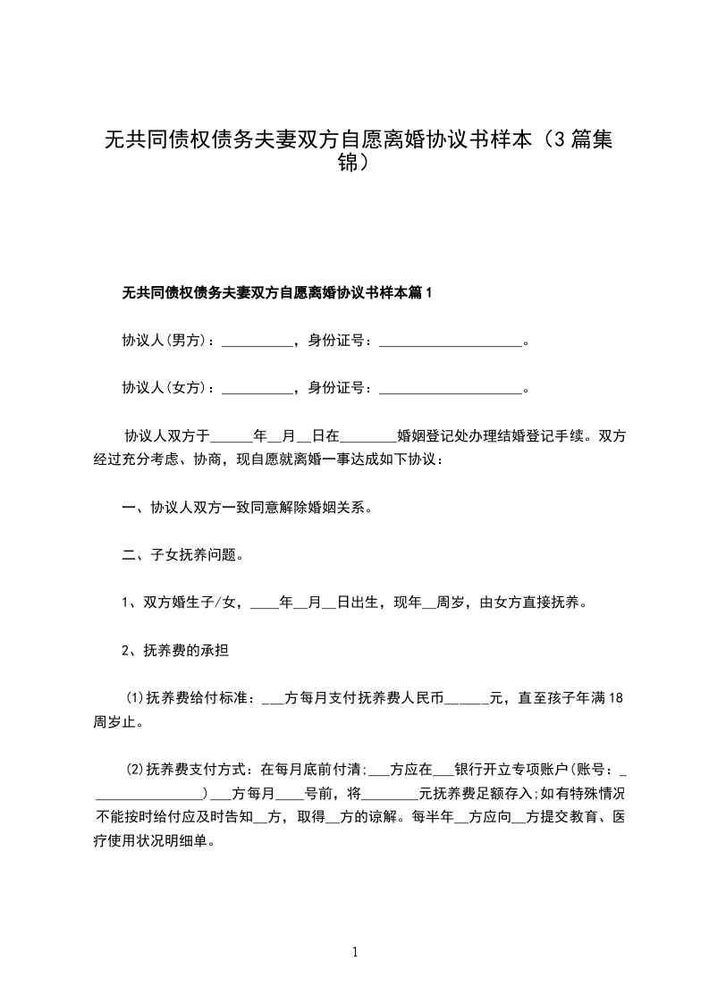 八、本协议一式三份,男、女双方各执一份,婚姻登记机关存档一份。